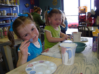 The Mud Room in Lubbock is a pretty cool store. You can pick out your unfinished ceramic merchandise, paint it however you please, and they will fire and glaze it for you. The girls, Emily, Annabelle and I spent Saturday afternoon painting our hearts out! The girls painted coffee mugs, and Belle (with the help of Emily) painted a few items herself! We had lots of fun, and I hope our special projects turn out...I get to pick them up next week. Painting is one of the girls' favorite past times, so I am sure we will be visiting The Mud Room soon! (I would like to go without the aid of my little artists, just because I could literally spend HOURS at that place, and tons of money!)